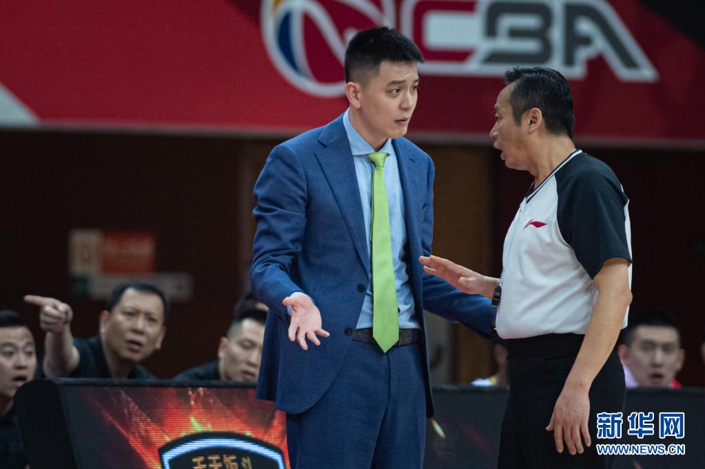 4月21日,遼寧本鋼隊主教練楊鳴(左)在比賽中與第一副裁判崔哲雄交流。