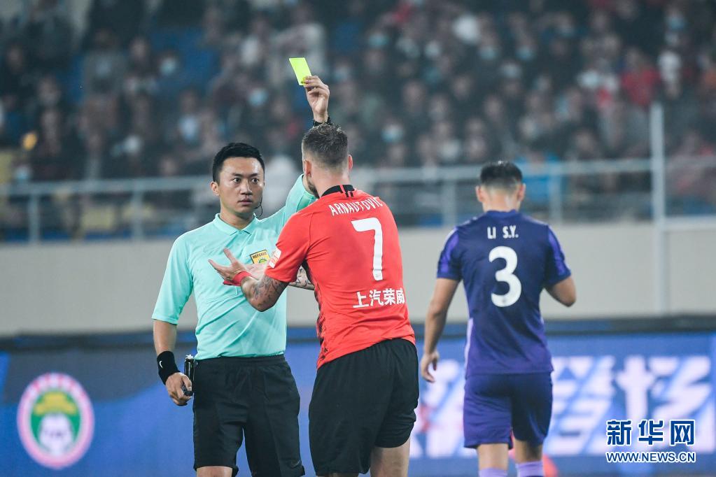 4月22日,主裁判唐順齊向上海海港隊(duì)球員阿瑙托維奇出示黃牌。 當(dāng)日,在2021賽季中國(guó)足球協(xié)會(huì)超級(jí)聯(lián)賽(蘇州賽區(qū))第一輪比賽中,上海海港隊(duì)以6比1戰(zhàn)勝天津津門虎隊(duì)。 新華社記者 李博 攝