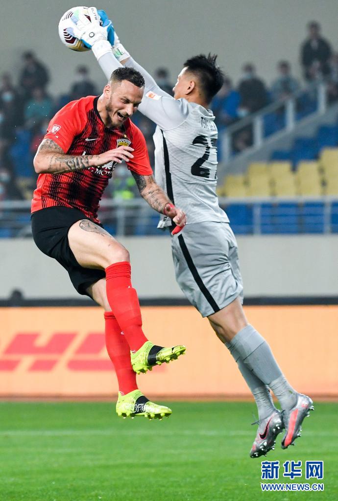 4月22日,天津津門虎隊(duì)守門員滕尚坤(右)與上海海港隊(duì)球員阿瑙托維奇在比賽中拼搶。 當(dāng)日,在2021賽季中國(guó)足球協(xié)會(huì)超級(jí)聯(lián)賽(蘇州賽區(qū))第一輪比賽中,上海海港隊(duì)以6比1戰(zhàn)勝天津津門虎隊(duì)。 新華社記者 李博 攝 |