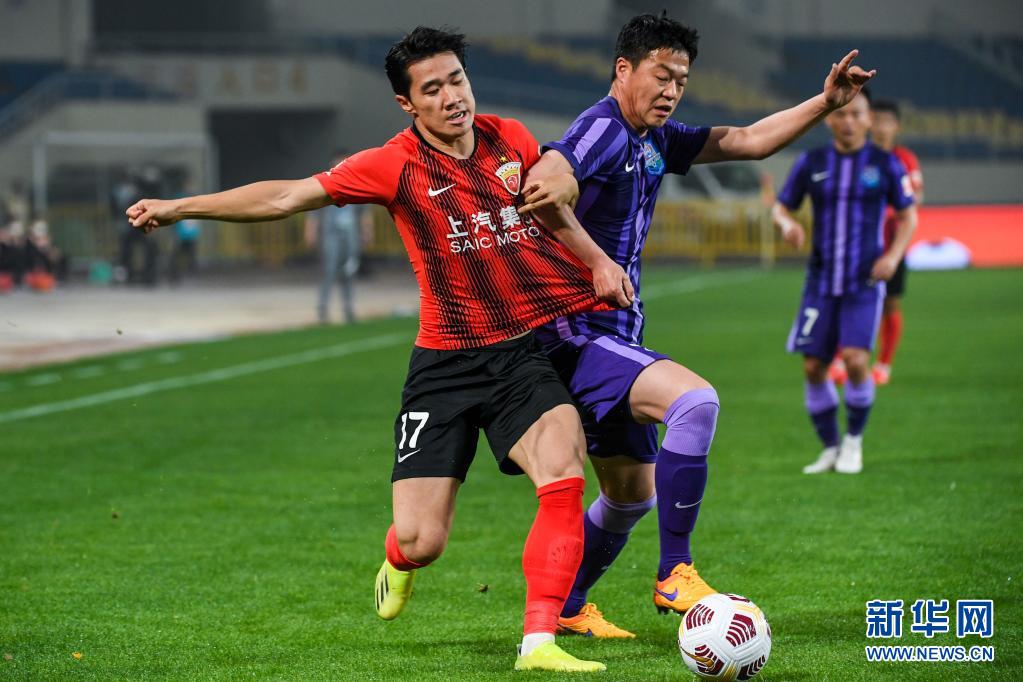 4月22日,上海海港隊(duì)球員陳彬彬(左)在比賽中拼搶。 當(dāng)日,在2021賽季中國(guó)足球協(xié)會(huì)超級(jí)聯(lián)賽(蘇州賽區(qū))第一輪比賽中,上海海港隊(duì)以6比1戰(zhàn)勝天津津門虎隊(duì)。 新華社記者 李博 攝