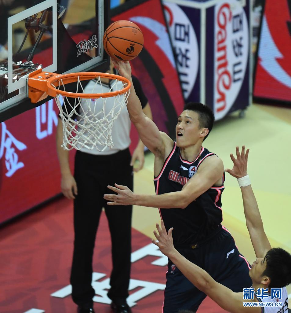 4月22日,廣東東莞大益隊球員周鵬(上)在比賽中上籃。
