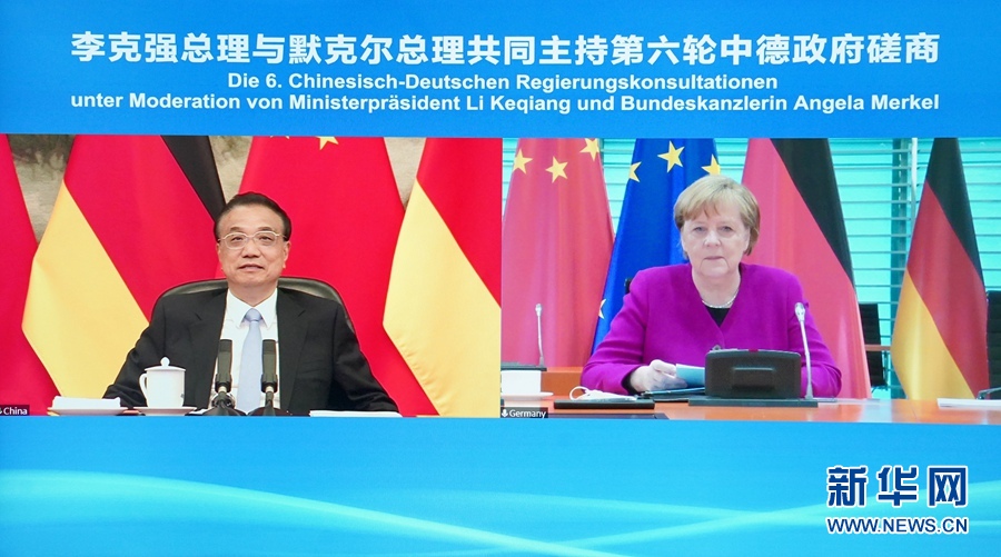4月28日下午,國(guó)務(wù)院總理李克強(qiáng)在北京人民大會(huì)堂以視頻形式與德國(guó)總理默克爾共同主持第六輪中德政府磋商。新華社記者 岳月偉 攝