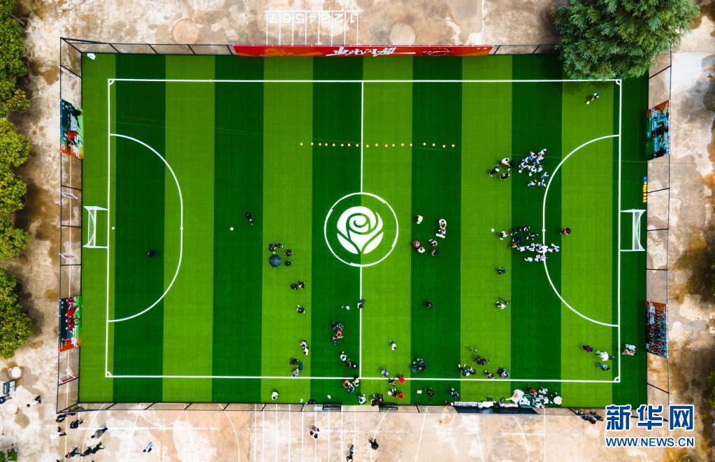 這是4月28日拍攝的建成在石林彝族自治縣長(zhǎng)湖鎮(zhèn)維則青聯(lián)希望小學(xué)的首個(gè)中國(guó)女足主題球場(chǎng)(無(wú)人機(jī)照片)。