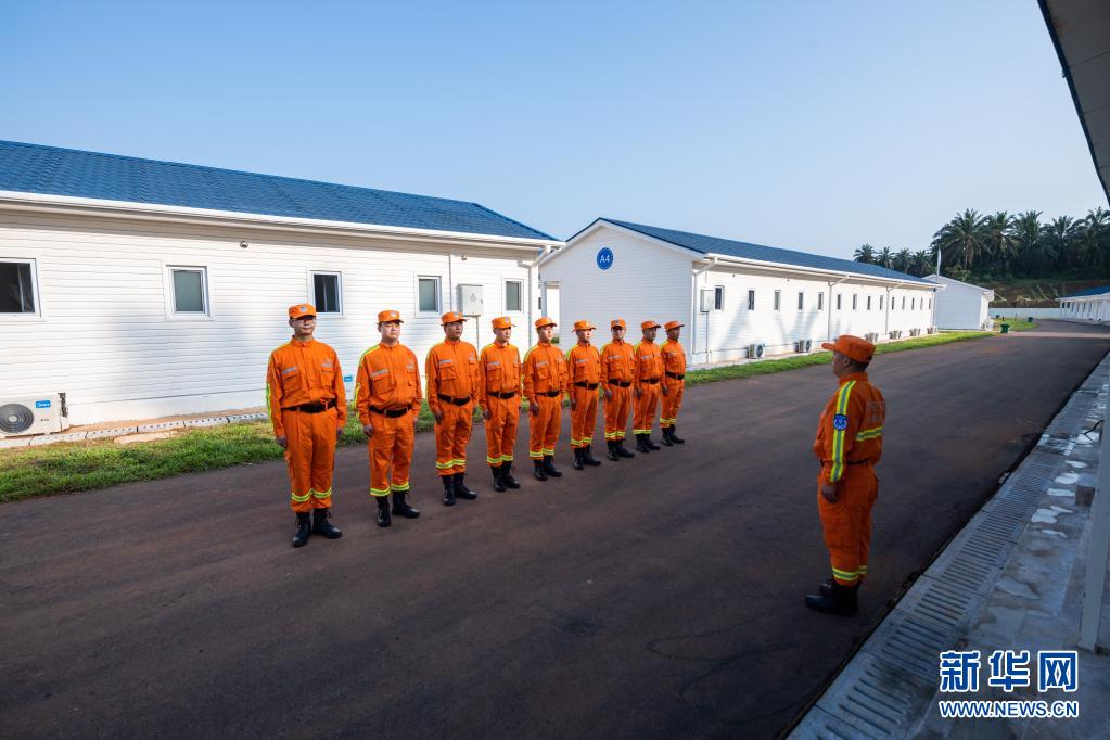 在中國(guó)交通建設(shè)集團(tuán)有限公司(中國(guó)交建)馬來西亞東海岸鐵路項(xiàng)目總經(jīng)理部關(guān)丹分址,項(xiàng)目應(yīng)急救援隊(duì)的隊(duì)員們集合晨練(4月10日攝)。