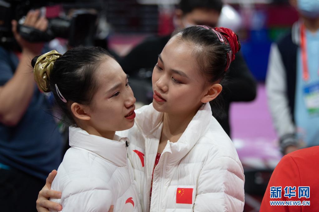 5月5日,廣東隊(duì)選手陳一樂(lè)(右)與隊(duì)友歐鈺珊在比賽后擁抱。 當(dāng)日,2021年全國(guó)體操錦標(biāo)賽暨東京奧運(yùn)會(huì)選拔賽、第十四屆全運(yùn)會(huì)體操資格賽女子團(tuán)體賽在四川成都舉行。廣東隊(duì)、北京隊(duì)、浙江隊(duì)分別以222.428、216.061、214.695分的成績(jī)獲得女子團(tuán)體一、二、三名。 新華社記者 胥冰潔 攝