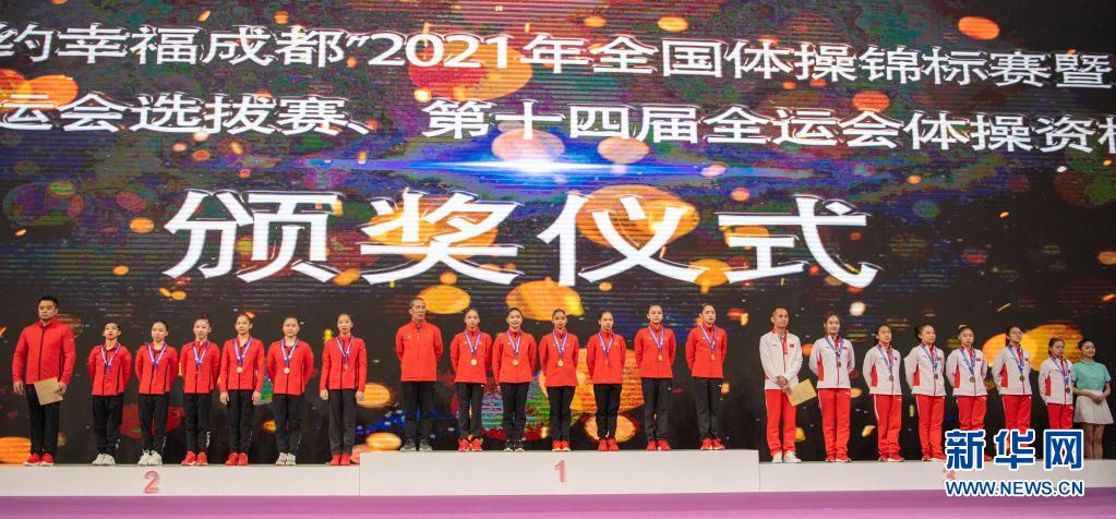 5月5日,廣東隊(duì)(中)、北京隊(duì)(左)、浙江隊(duì)在頒獎(jiǎng)儀式上。 當(dāng)日,2021年全國(guó)體操錦標(biāo)賽暨東京奧運(yùn)會(huì)選拔賽、第十四屆全運(yùn)會(huì)體操資格賽女子團(tuán)體賽在四川成都舉行。廣東隊(duì)、北京隊(duì)、浙江隊(duì)分別以222.428、216.061、214.695分的成績(jī)獲得女子團(tuán)體一、二、三名。 新華社記者 胥冰潔 攝