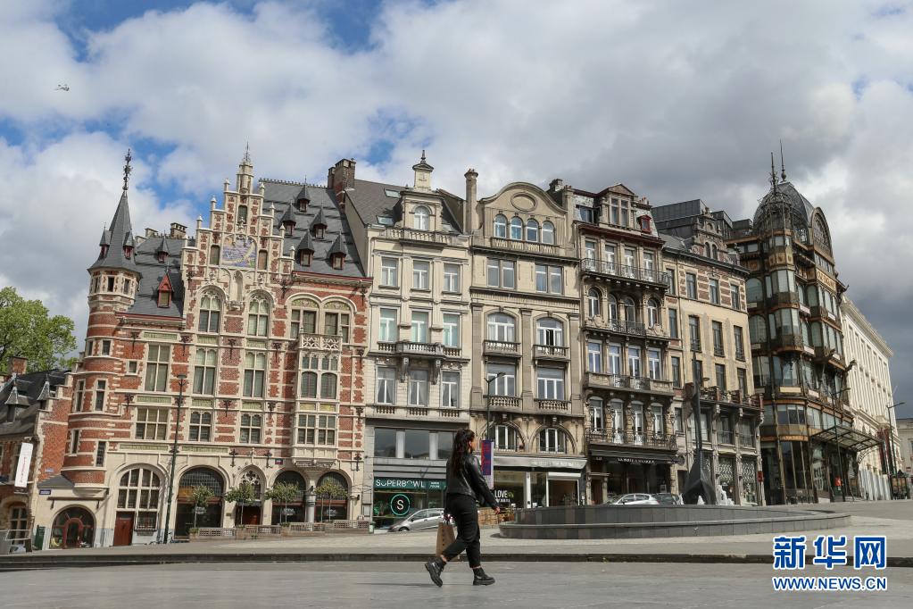 5月4日,一名女子在比利時布魯塞爾街頭行走。