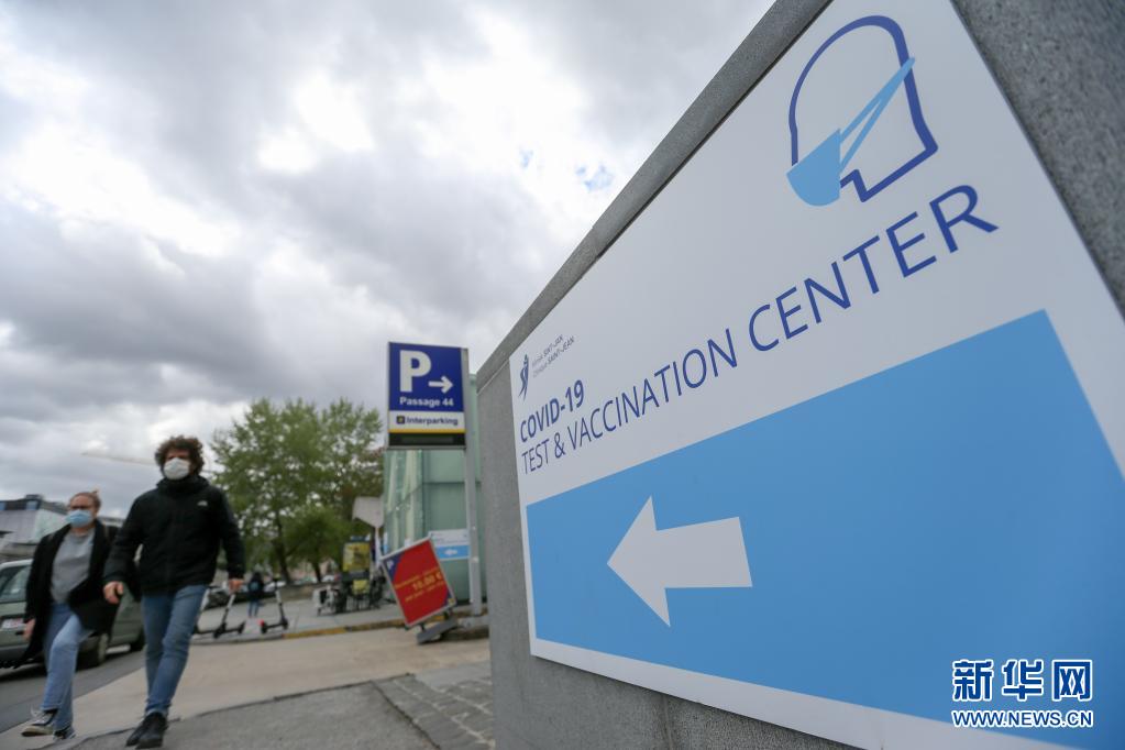 5月4日,人們走過比利時布魯塞爾的新冠檢測和疫苗接種中心的指示牌。