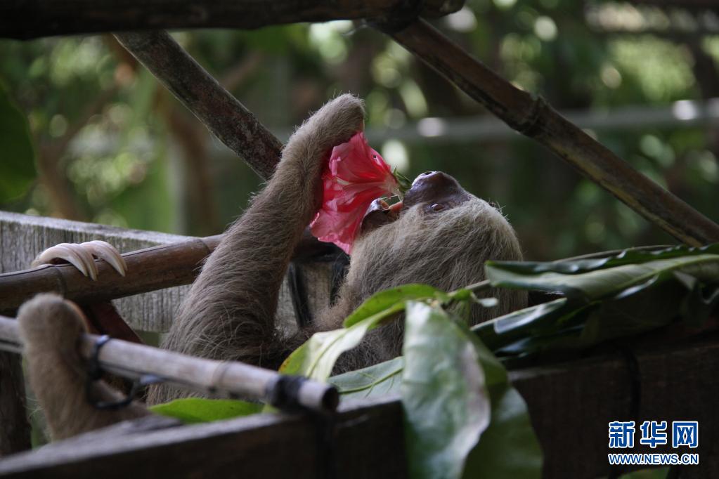 4月20日,樹懶“拉蒂”在位于哥斯達黎加埃雷迪亞的“巨嘴鳥救助牧場”享用它的“鮮花早餐”。 新華社記者 范小林 攝 |