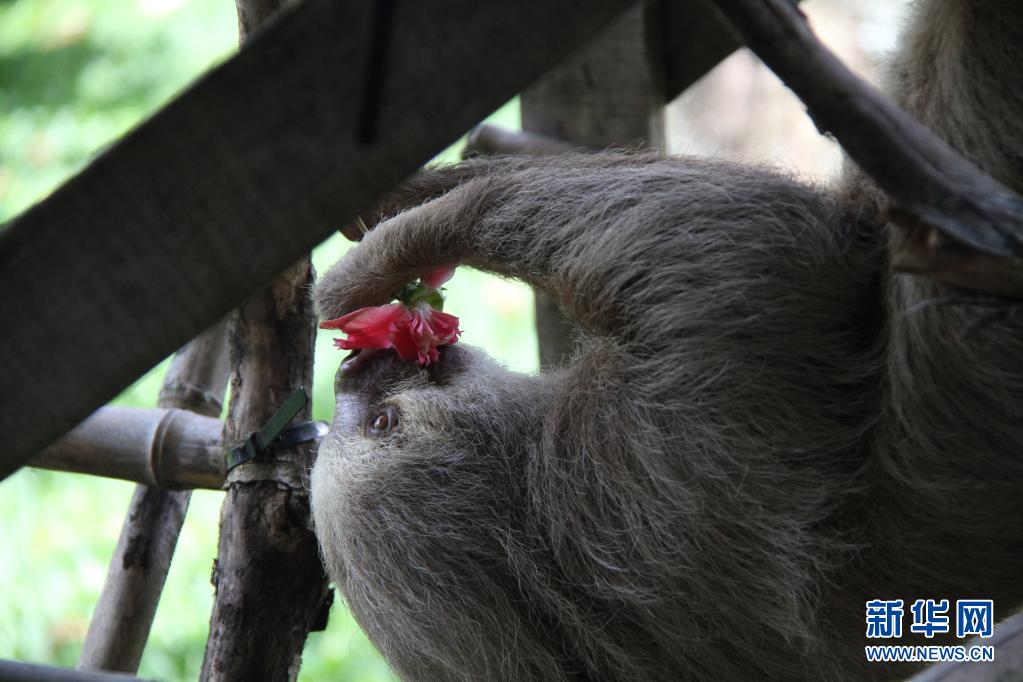 4月20日,樹懶“拉蒂”在位于哥斯達黎加埃雷迪亞的“巨嘴鳥救助牧場”享用它的“鮮花早餐”。 新華社記者 范小林 攝