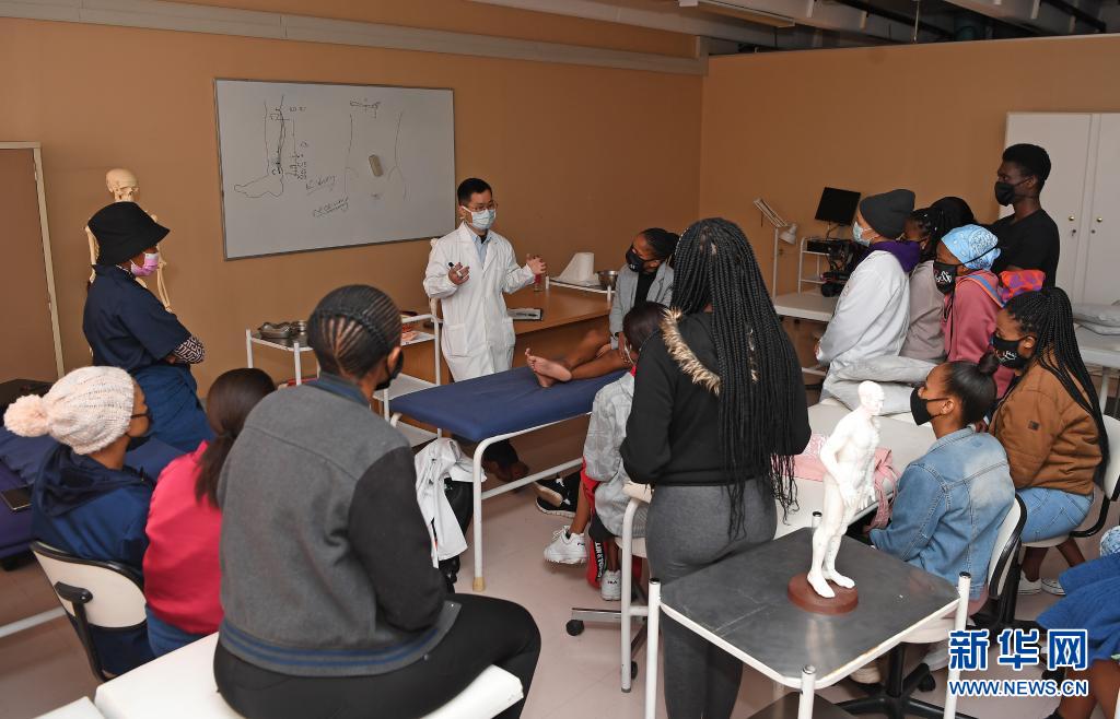 6月9日,針灸課老師胡紫景在南非約翰內斯堡大學給同學們講解針灸相關知識。