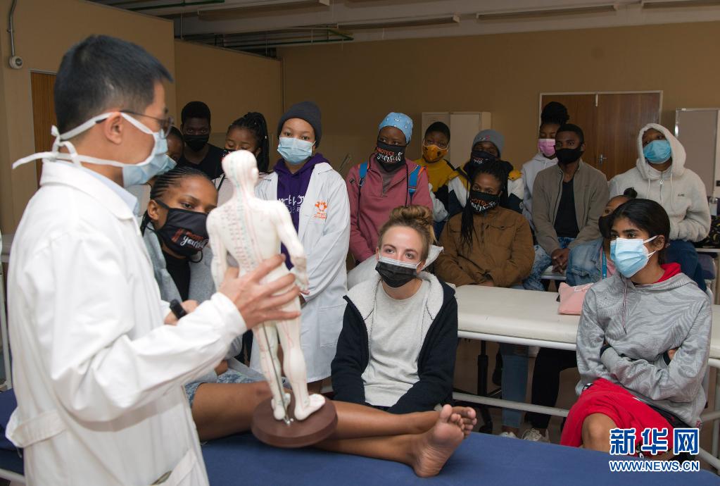 6月9日,針灸課老師胡紫景在南非約翰內(nèi)斯堡大學(xué)給同學(xué)們講解人體穴位分布。 南非約翰內(nèi)斯堡大學(xué)2020年2月正式開設(shè)針灸課,十分受學(xué)生們歡迎。隨著南非新冠疫情逐步好轉(zhuǎn),針灸課程恢復(fù)線下面對面教學(xué),每周會有一到兩次線下課程,讓老師能更好地為同學(xué)們答疑解惑。 新華社記者 陳誠 攝