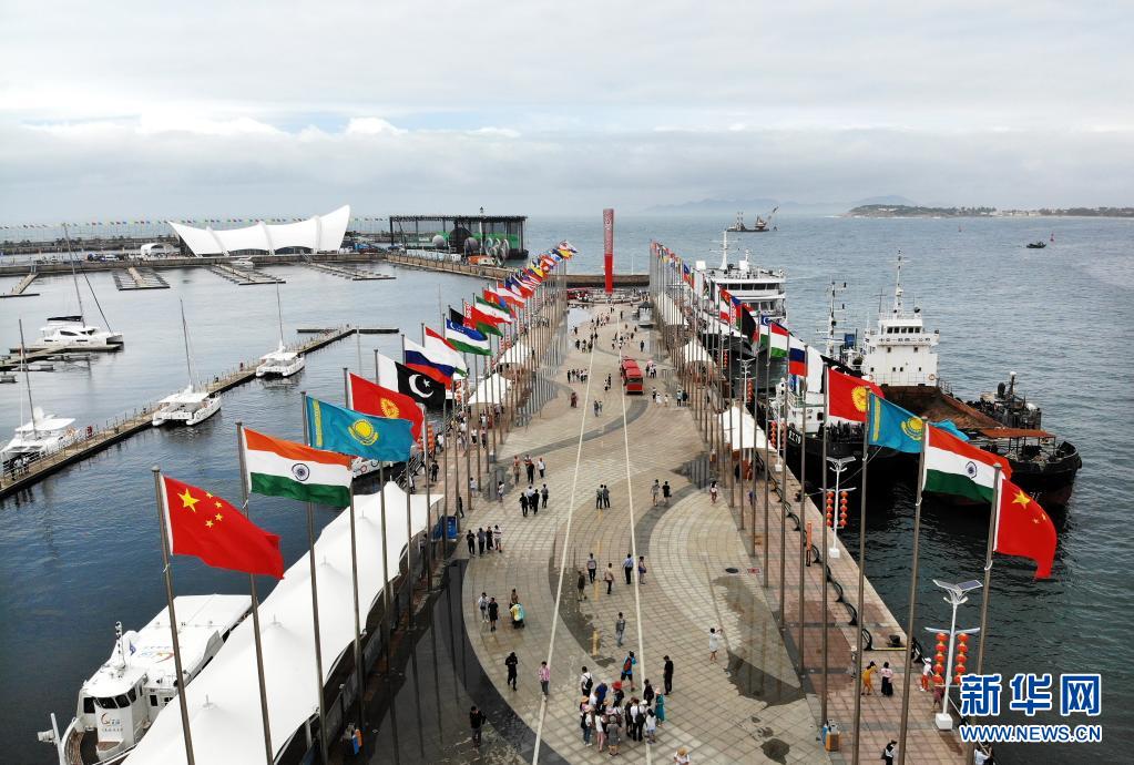 游客在青島奧帆中心旗陣廣場游覽(2018年7月1日攝,無人機照片)。新華社記者 李紫恒 攝