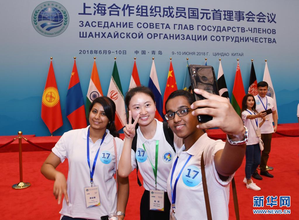 參加第三屆上海合作組織青年交流營的營員在青島國際會議中心參觀留影(2018年7月16日攝)。新華社記者 李紫恒 攝