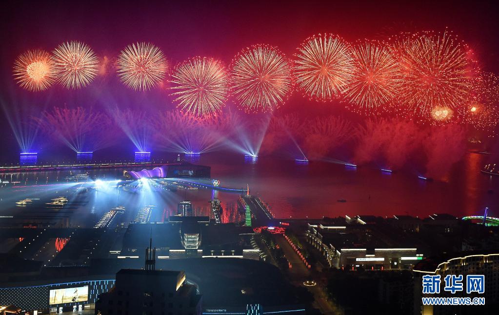 2018年6月9日至10日,上海合作組織成員國元首理事會第十八次會議在青島召開。這是9日晚在青島舉行的《有朋自遠方來》燈光焰火藝術表演。新華社記者 李紫恒 攝