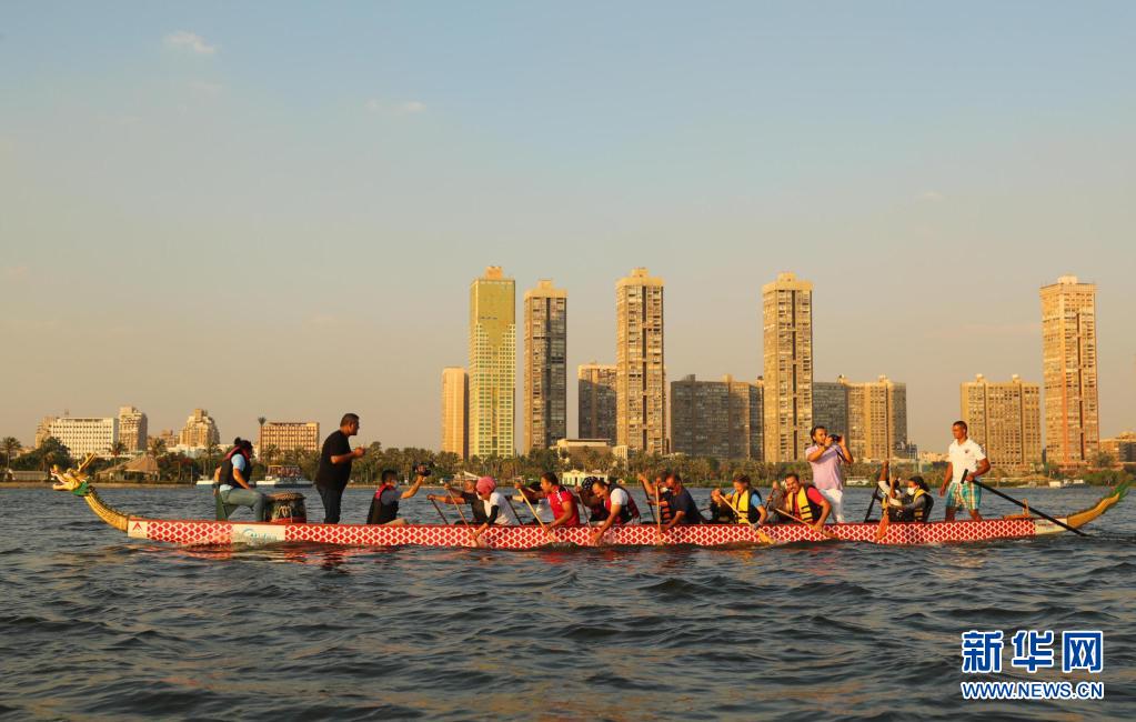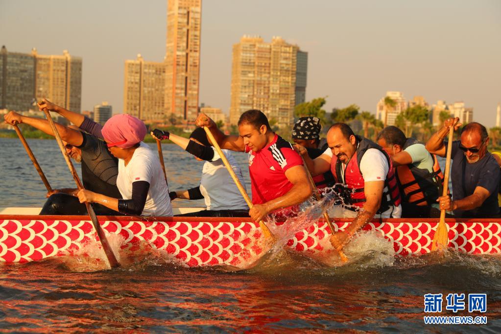 6月14日,在埃及首都開羅,埃及龍舟文化體驗基地的龍舟隊在尼羅河上參加龍舟競賽。新華社記者 隋先凱 攝