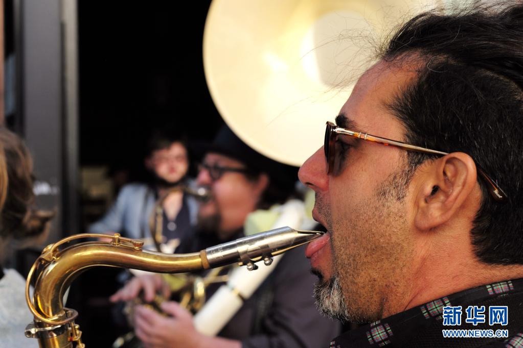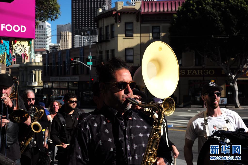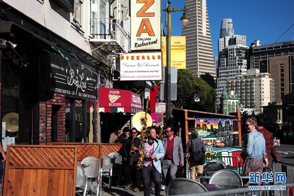 6月15日,一支樂隊在美國加利福尼亞州舊金山街頭演奏。 美國加州于6月15日解除防疫等級限制的相關規定,全面恢復開放經濟活動。 新華社記者 吳曉凌 攝