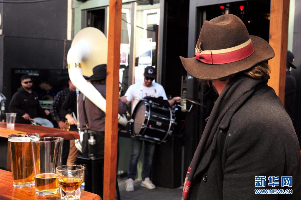 6月15日,一支樂隊在美國加利福尼亞州舊金山一家酒吧外演奏。 美國加州于6月15日解除防疫等級限制的相關規定,全面恢復開放經濟活動。 新華社記者 吳曉凌 攝