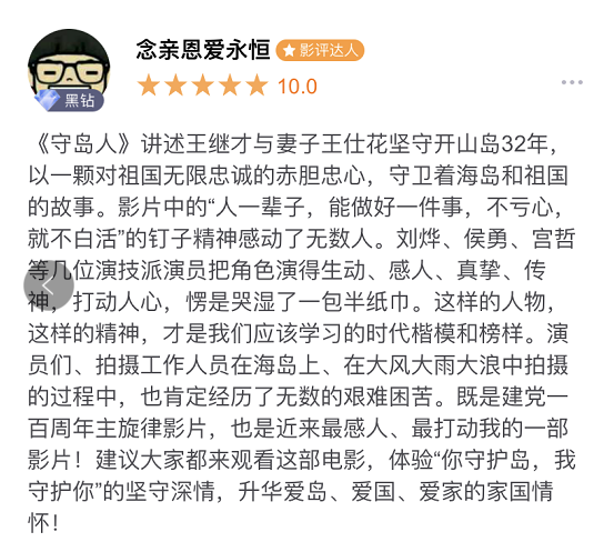 在慶祝中國共產(chǎn)黨成立100周年之際,由解放軍文化藝術(shù)中心、福建省委宣傳部等聯(lián)合攝制,八一電影制片廠與福建電影制片廠等聯(lián)合出品,國家一級導(dǎo)演陳力執(zhí)導(dǎo)兼任總編劇,張和平任藝術(shù)總監(jiān),劉燁、宮哲主演,侯勇、孫維民、宋春麗、張一山、陳創(chuàng)等聯(lián)袂出演,根據(jù)“人民楷模”王繼才同志守島衛(wèi)國32年感人事跡創(chuàng)拍的電影《守島人》,已于6月18日全國熱映。