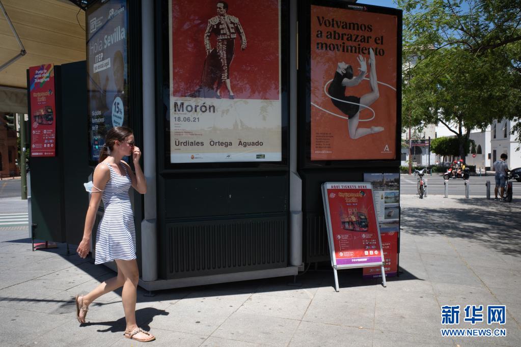6月26日,一名女子走在西班牙塞維利亞街頭。