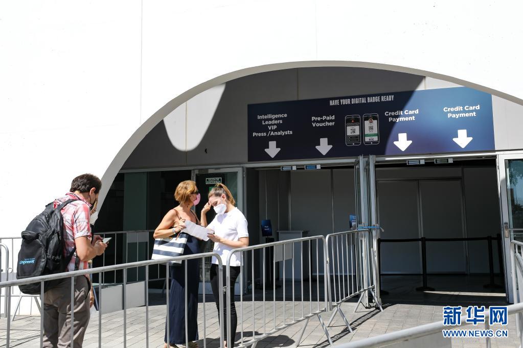 6月27日,在西班牙巴塞羅那,人們準備進入2021世界移動通信大會的新冠檢測中心。