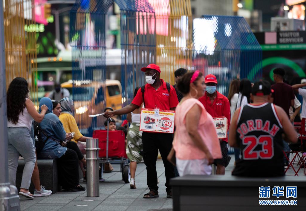 7月2日,觀光大巴推銷員在美國紐約時報廣場上向游客推薦線路。