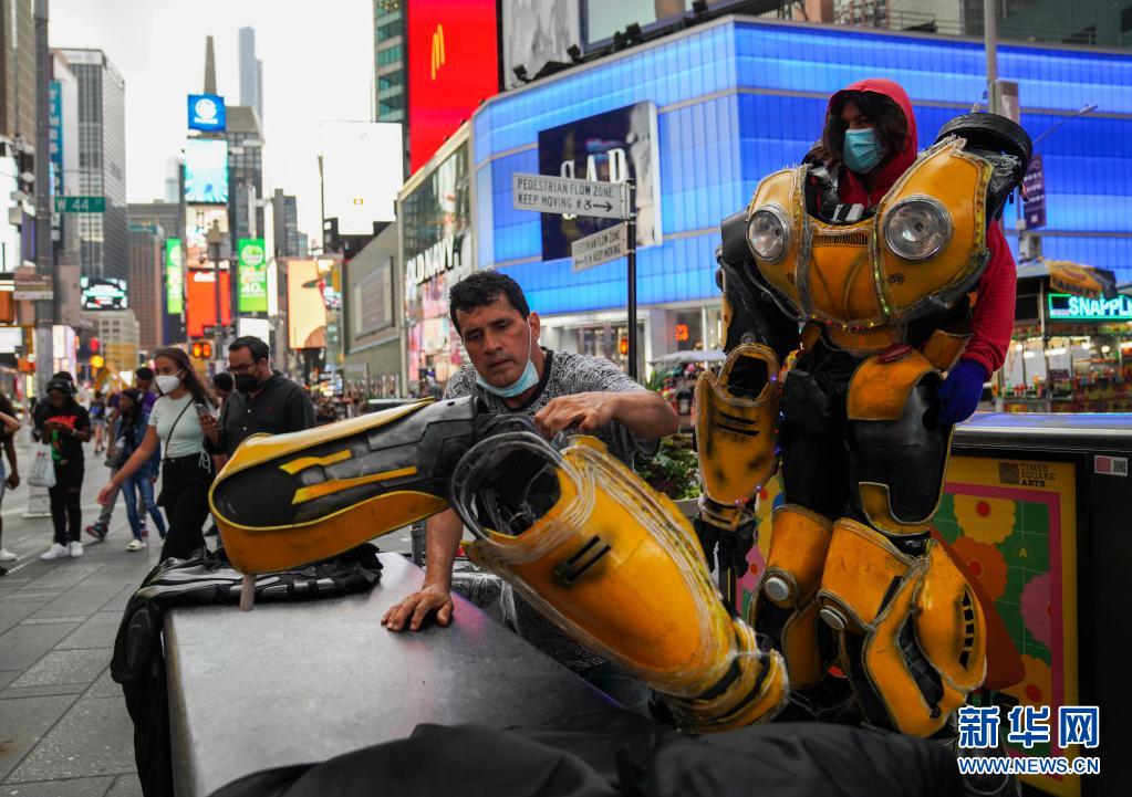 7月2日,一名街頭演員在美國紐約時報廣場上幫同行穿服裝。