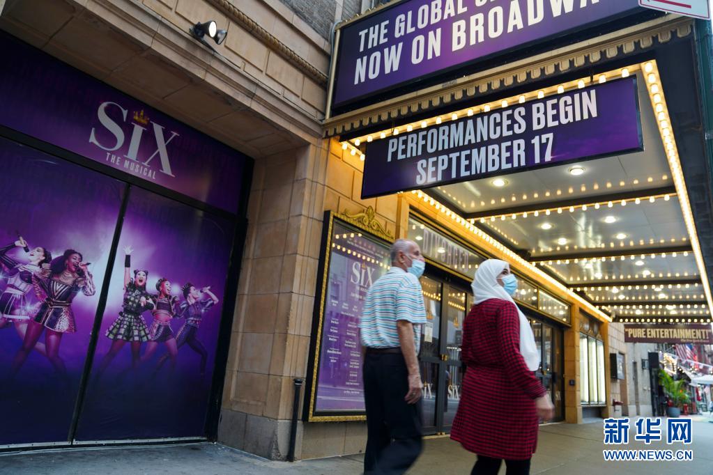 7月2日,行人從美國紐約百老匯一家劇院寫有“九月開演”的廣告牌下走過。