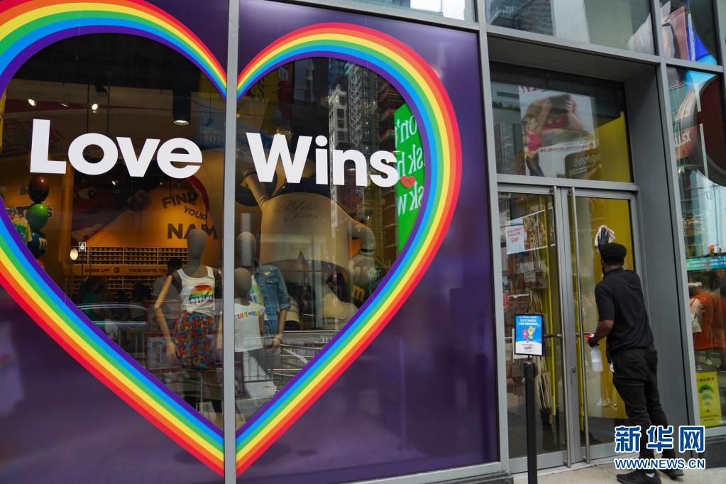 7月2日,工作人員在美國紐約時報廣場一家商店外清潔大門。