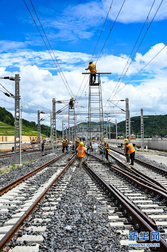7月2日,工人在中老昆萬鐵路寧洱站施工。 目前,中老昆(明)萬(象)鐵路國內段建設進展順利,路基、橋梁已全部完成,車站站房全面進入裝飾裝修階段,鋪軌工程接近尾聲。中老昆萬鐵路北起云南昆明,南至老撾首都萬象,由國內段、老撾段兩段組成,全長1000多公里。 新華社記者 王冠森 攝