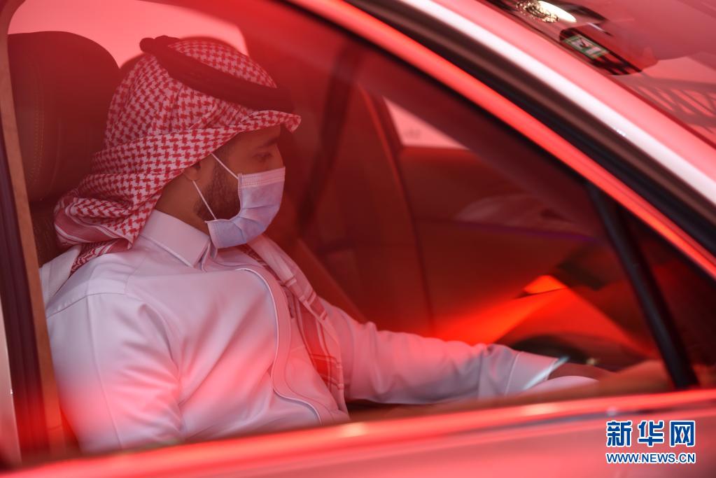 6月30日,在沙特利雅得的中國一汽紅旗旗艦店內(nèi),一名男子在車內(nèi)自拍。新華社記者 王海洲 攝
