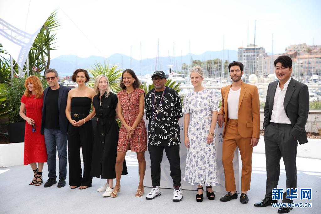 7月6日,第74屆法國戛納國際電影節主競賽單元評委出席拍照式。從左至右:米萊娜·法爾梅、小克萊伯·門多薩、瑪吉·吉倫哈爾、杰茜卡·豪斯納、馬蒂·迪奧普、斯派克·李、梅拉尼·洛朗、塔赫爾·拉希姆、宋康昊。