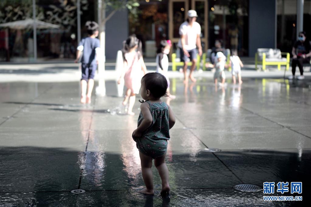 7月10日,兒童在美國舊金山灣區城市圣拉蒙一個購物中心前的廣場上玩水。 美國氣象部門數據顯示,美國剛剛送走有記錄以來的“最熱6月”,西部多州本周末又迎來新的熱浪,預計持續至12日夜間。 新華社記者 吳曉凌 攝