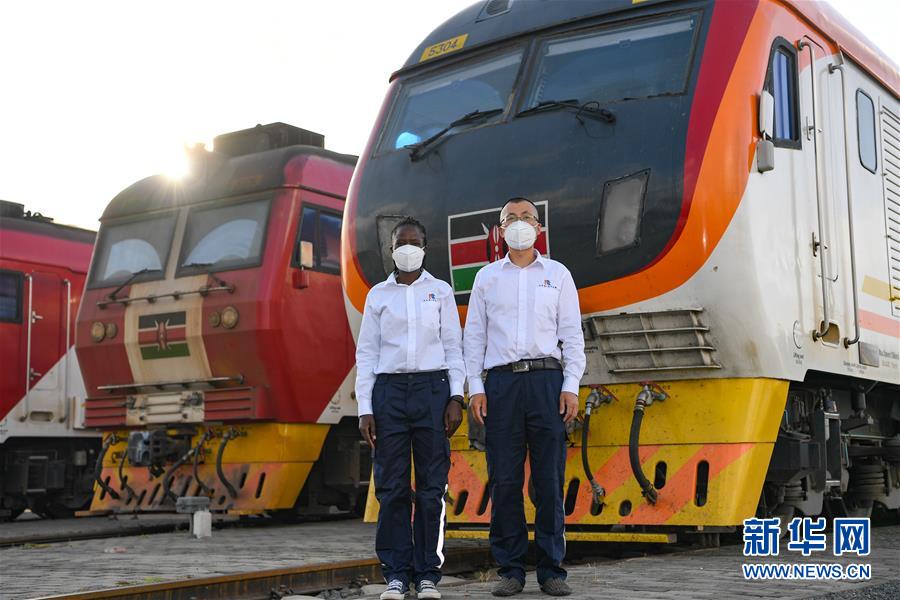 3月22日,在肯尼亞首都內羅畢,蒙內鐵路指導司機楊明和他的肯尼亞女徒弟康西莉亞在機車前合影。 新華社記者 李琰 攝