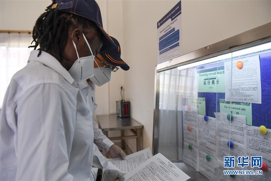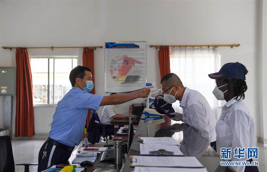 3月22日,在肯尼亞首都內羅畢,蒙內鐵路指導司機楊明和他的肯尼亞女徒弟康西莉亞在工作區進行崗前登記時測量體溫。 新華社記者 李琰 攝