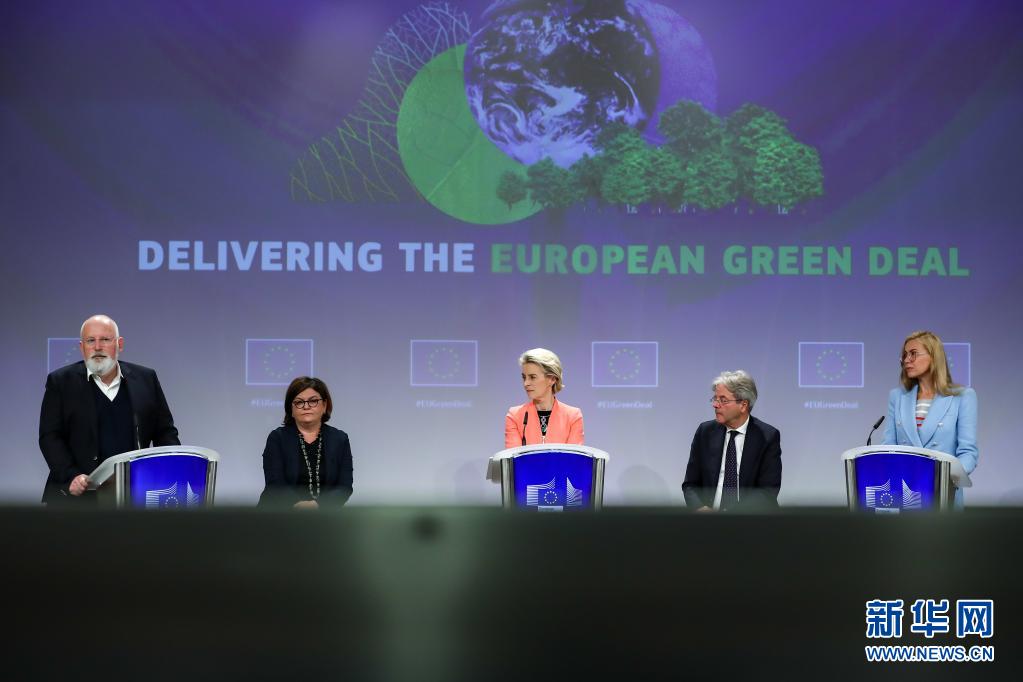 7月14日,歐盟委員會主席馮德萊恩(左三)、第一副主席蒂默曼斯(左一)等在比利時布魯塞爾出席應對氣候變化一攬子計劃提案發布會。新華社記者 張鋮 攝