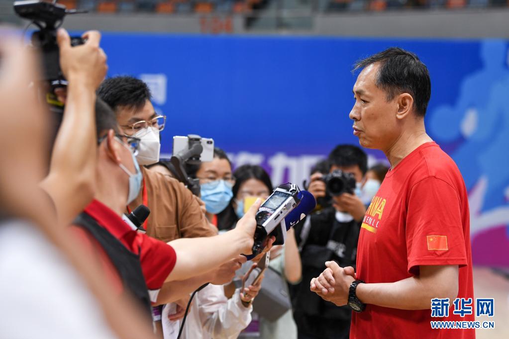 中國女籃在江蘇蘇州奧體中心體育館舉行公開訓練課,主教練許利民(右一)在訓練結束后接受采訪(2021年7月9日攝)。 新華社記者李博攝