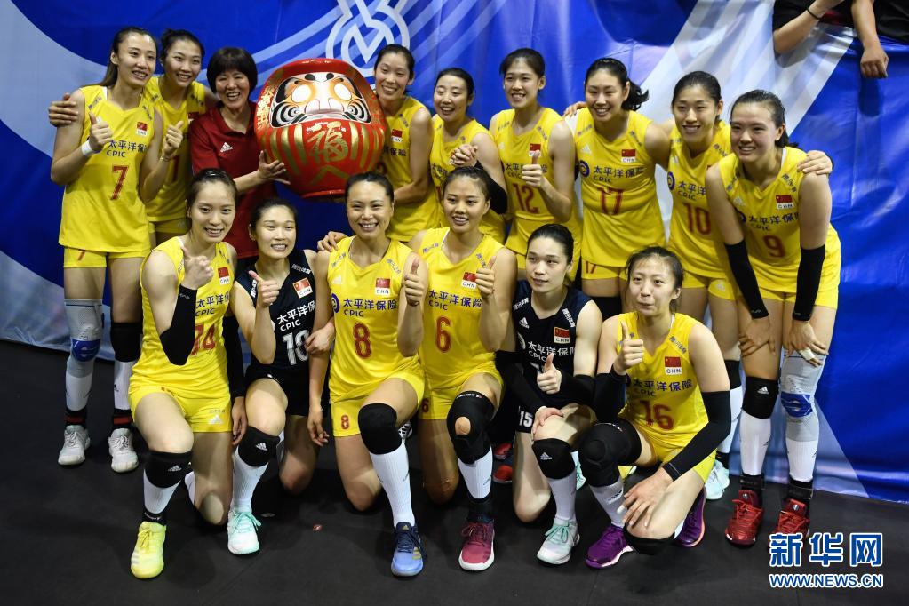 在浙江寧波市北侖區舉行的2019國際排聯東京奧運會女排資格賽B組比賽中,中國隊以3比0戰勝土耳其隊,獲得小組第一,直接獲得東京奧運會的參賽資格。圖為中國女排在賽后合影慶祝(2019年8月4日攝)。 新華社記者黃宗治攝