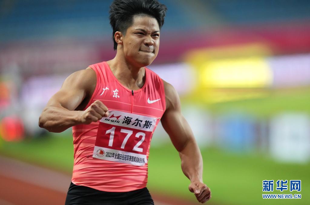 在浙江省紹興市上虞體育場舉行的2021年全國田徑冠軍賽暨奧運會選拔賽男子100米決賽中,廣東隊選手蘇炳添以9秒98的成績奪得冠軍(2021年6月11日攝)。 新華社記者李一博攝