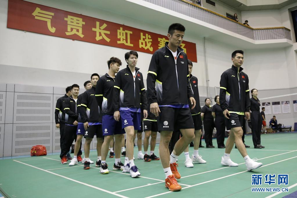 湯姆斯杯模擬賽在國家體育總局訓練局羽毛球館進行,諶龍(前)等參賽球員在賽前出場(2020年10月4日攝)。 新華社記者張晨攝
