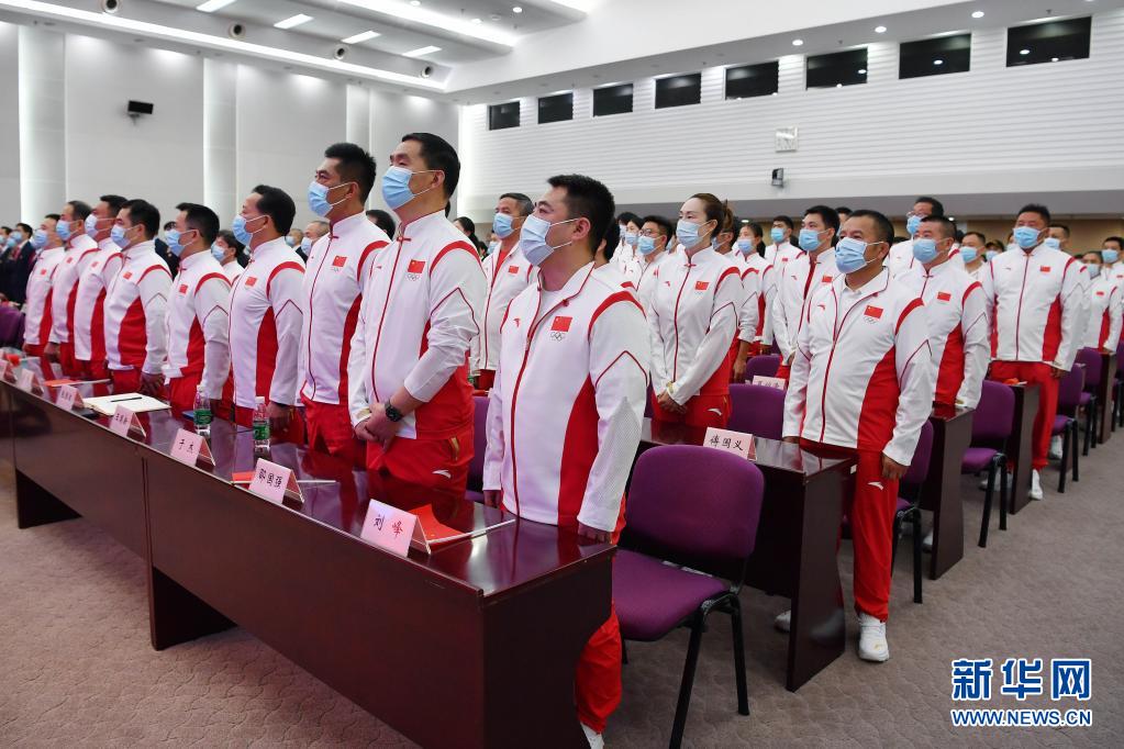 東京奧運會中國體育代表團工作會議在國家體育總局舉行。圖為代表團成員在奏國歌儀式上(2021年7月14日攝)。 新華社記者陶希夷攝
