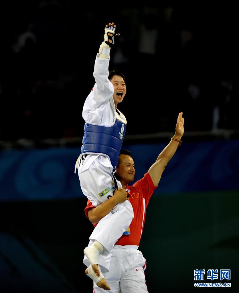 在北京奧運會跆拳道女子49公斤級決賽后,中國選手吳靜鈺(上)與教練慶祝奪冠(2008年8月20日攝)。 新華社記者王毓國攝