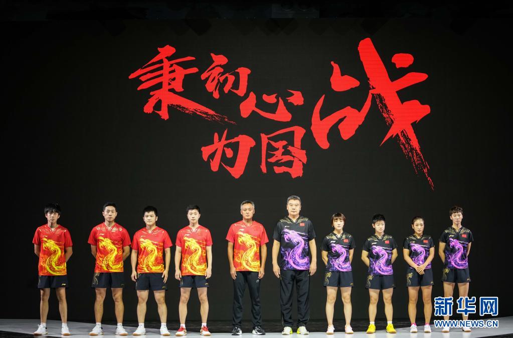 在山東威海舉行的發布會上,中國乒乓球隊身穿東京奧運會全新戰袍集體亮相(2021年6月23日攝)。 新華社記者朱崢攝