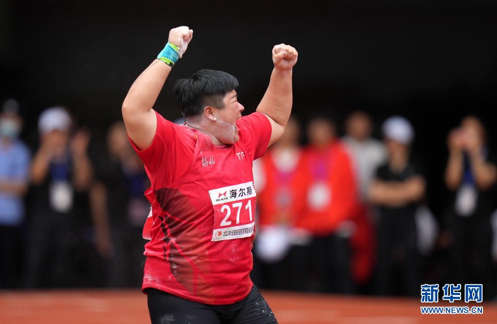 在浙江省紹興市上虞體育場舉行的2021年全國田徑冠軍賽暨奧運會選拔賽女子鉛球決賽中,河北隊選手鞏立姣慶祝(2021年6月13日攝)。 新華社記者李一博攝