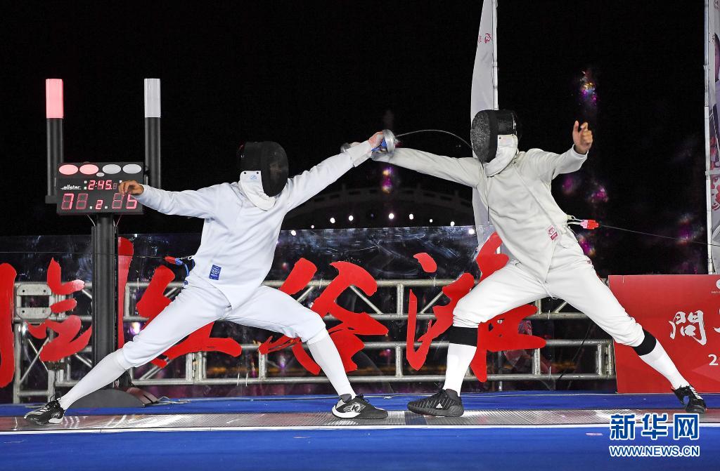 在南昌舉行的2020中國擊劍大師賽男子重劍決賽中,王子杰(左)對陣石高峰(2020年10月31日攝)。 新華社記者萬象攝