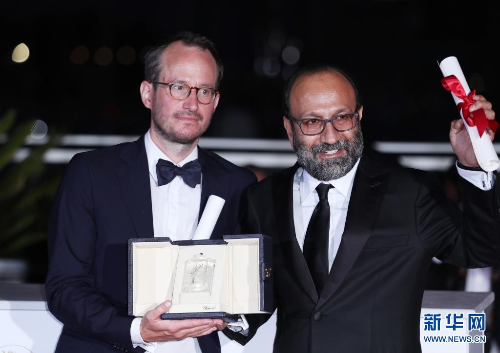 7月17日,在法國戛納,伊朗影片《一個英雄》的導演阿斯哈·法哈蒂(右)和芬蘭影片《六號車廂》的導演尤霍·庫奧斯馬寧出席拍照式?!兑粋€英雄》和《六號車廂》并列獲得本屆電影節評審團大獎。 第74屆戛納國際電影節17日閉幕。 新華社記者 高靜 攝