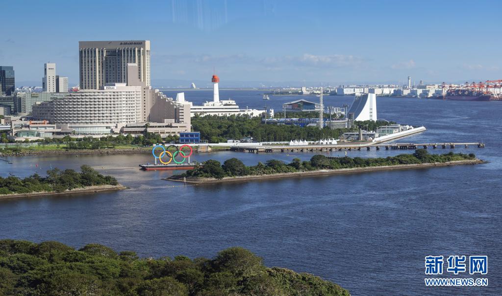 7月17日,一座奧運五環標志飄浮在日本東京灣。