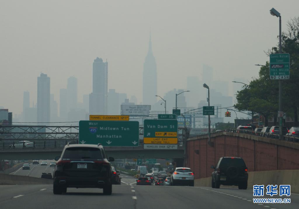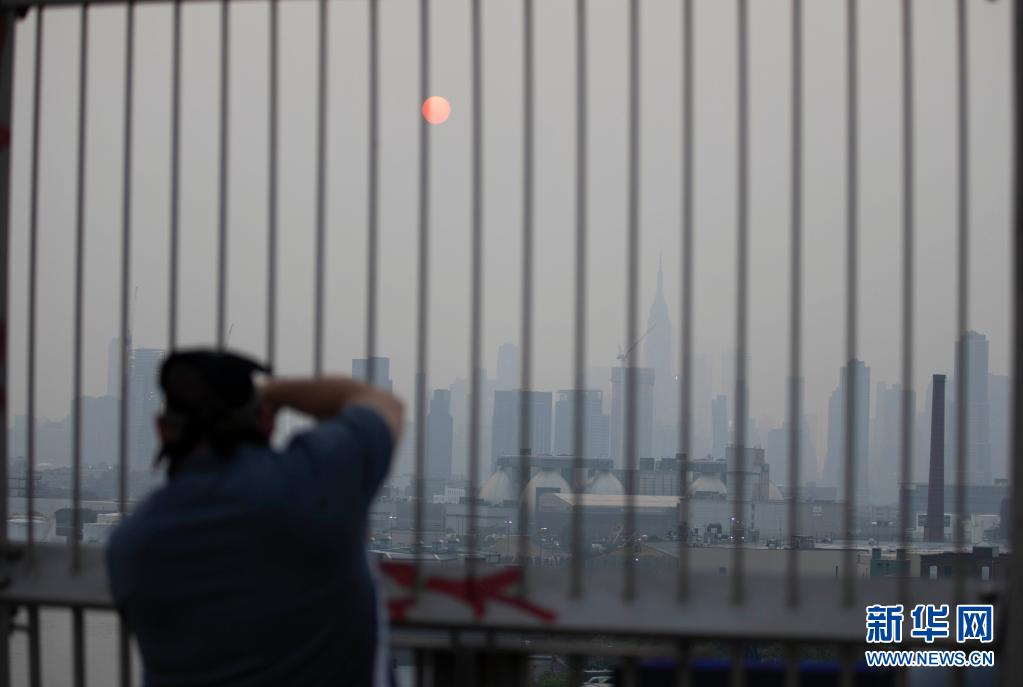 7月20日,美國紐約曼哈頓的高樓籠罩在霧霾中。 當日,受美國西部山火肆虐產生的煙塵影響,紐約出現霧霾天氣。 新華社記者 王迎 攝