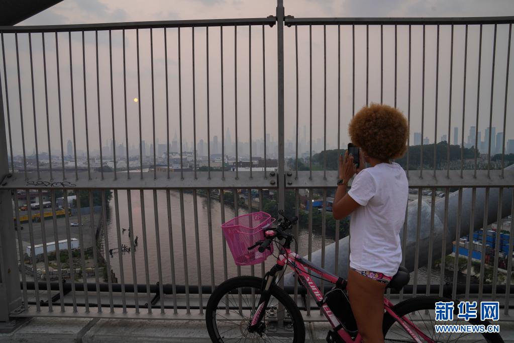 7月20日,一名女子在美國紐約拍攝高樓籠罩在霧霾中的景象。 當日,受美國西部山火肆虐產生的煙塵影響,紐約出現霧霾天氣。 新華社記者 王迎 攝 |