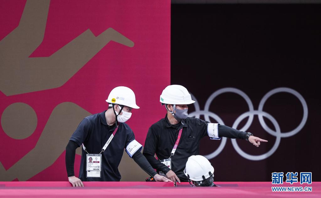 7月21日,日本武道館內(nèi)的奧運(yùn)會(huì)工作人員在為開賽做最后的準(zhǔn)備工作。